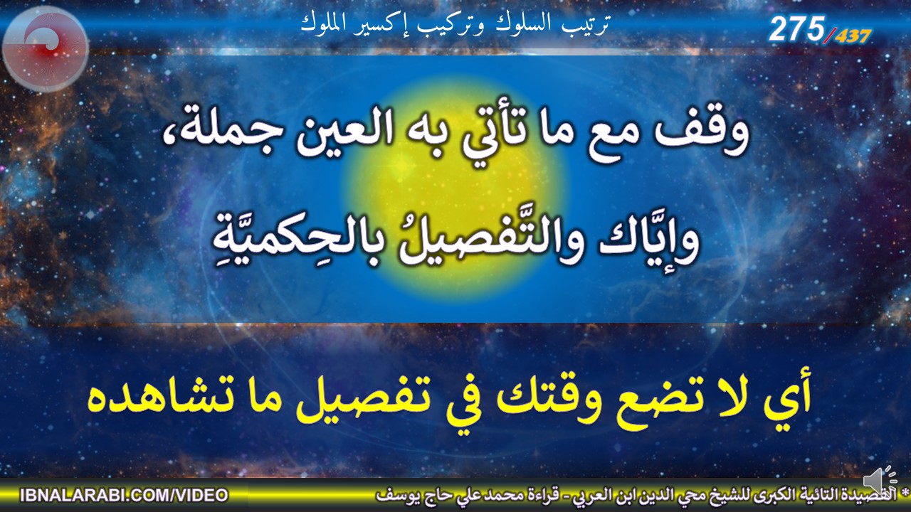 | وقف مع ما تأتي به العين جملة، *** وإيَّاك والتَّفصيلُ بالحِكميَّةِ | ||||