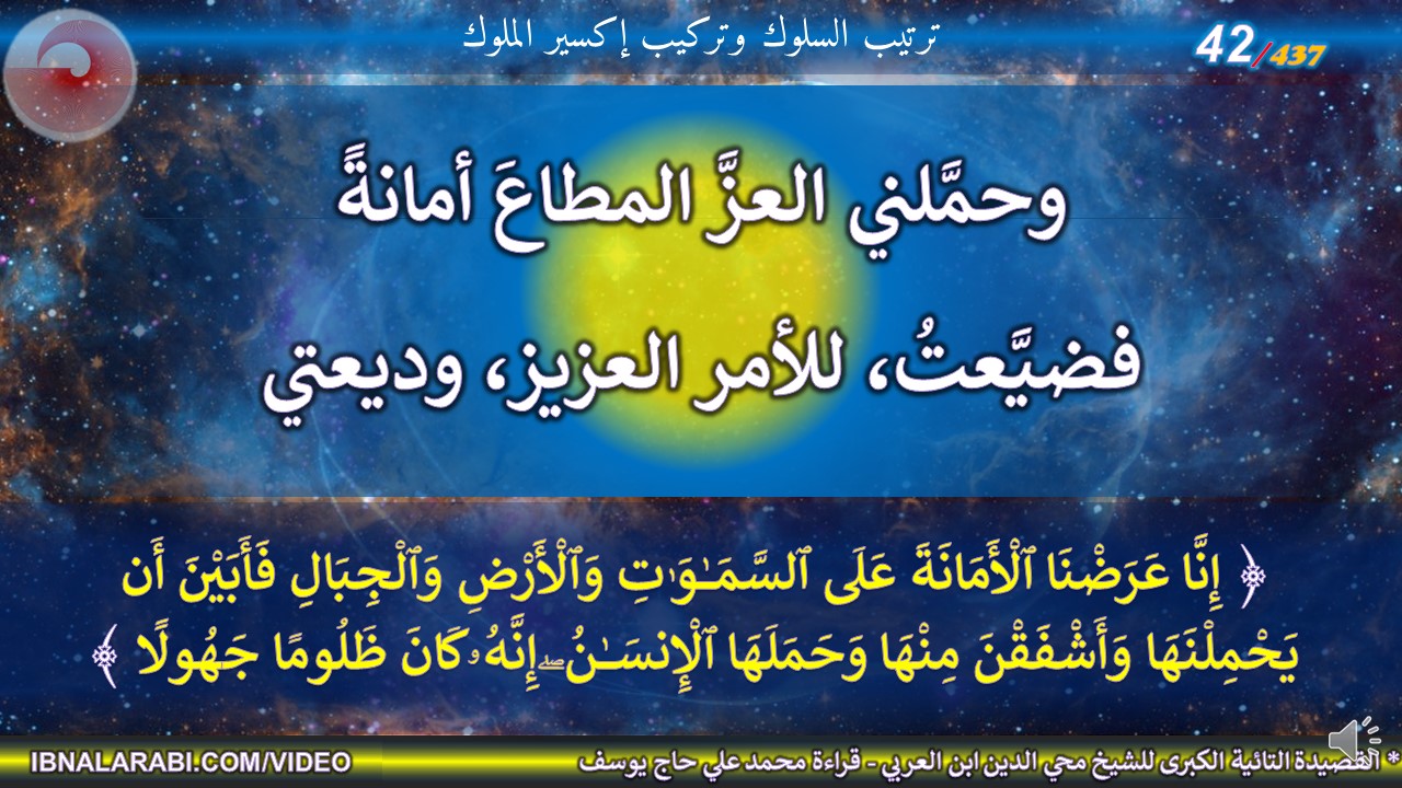﴿ إِنَّا عَرَضْنَا ٱلْأَمَانَةَ عَلَى ٱلسَّمَٰوَٰتِ وَٱلْأَرْضِ وَٱلْجِبَالِ فَأَبَيْنَ أَن يَحْمِلْنَهَاوَأَشْفَقْنَ مِنْهَا وَحَمَلَهَا ٱلْإِنسَٰنُ ۖ إِنَّهُۥ كَانَ ظَلُومًا جَهُولًا ﴾