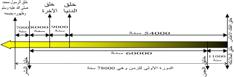 طبقاً للحديث المشهور عن النبي صلى الله عليه وسلم أنّه قال في خطبة حجة الوداع إن الزّمان قد استدار كهيئته يوم خلق الله السموات والأرض،[204] فإنّ ابن العربي يعدّ الكون بأكمل قد قضى دورة واحدة من بداية الخلق إلى وقت ارتباط روح النبي محمد صلى الله عليه وسلّم بجسمه، ويضيف إنّ هذه الدورة تساوي ثمانية وسبعين ألف سنة. فيقول ابن العربي في الفتوحات المكية إنّ أوّل وجود الزّمان كان في برج الميزان للعدل الروحاني وفي الاسم الباطن لمحمد صلَّى الله عليه وسلَّم بقوله "كنت نبياً وآدم بين الماء والطين"،[205] ثم استدار بعد انقضاء دورة الزّمان التي هي ثمانية وسبعون ألف سنة، ثم ابتدأت دورة أخرى من الزّمان بالاسم الظاهر فظهر فيها جسم محمد صلى الله عليه وسلّم وظهرت شريعته على التعيين والتصريح لا بالكناية، واتّصل الحكم بالآخرة.[206]