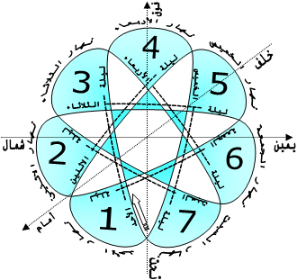 من جهة أخرى، يشير ابن العربي أنّه لكي يكون النهار والليل تابعان لليوم نفسه يجب أن يكون الحاكم على الساعة الأولى من النهار هو نفسه الحاكم على الساعة الأولى من الليل،[396] أمّا الساعات الأخرى فهي تنتمي في الحقيقة لأيّام أخرى بسبب التوالج المعقّد كما سنشرحه أدناه.