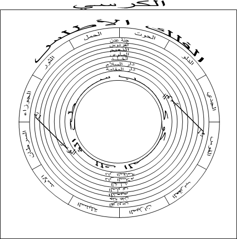 الشكل 3: الكرسي وما يحويه من الأفلاك مثل فلك البروج والجنان وفلك المنازل.[43]