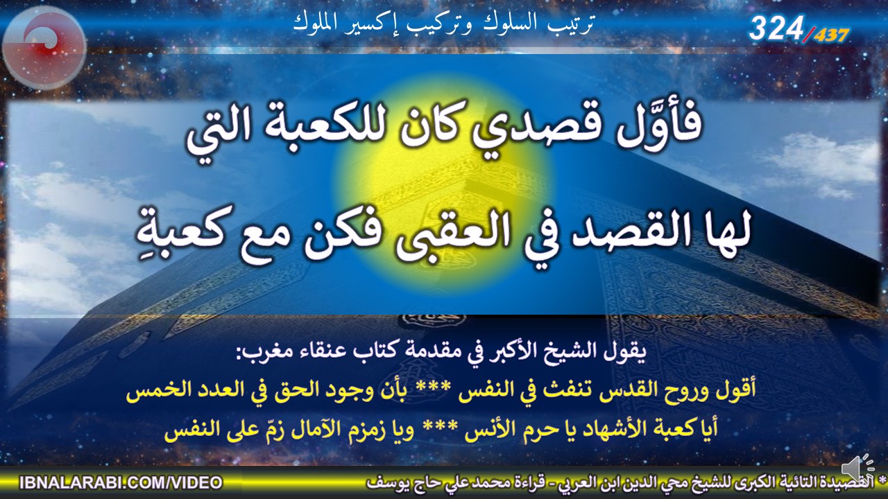 يقول الشيخ الأكبر في مقدمة كتاب عنقاء مغرب: أقول وروح القدس تنفث في النفس *** بأن وجود الحق في العدد الخمس أيا كعبة الأشهاد يا حرم الأنس *** ويا زمزم الآمال زمّ على النفس