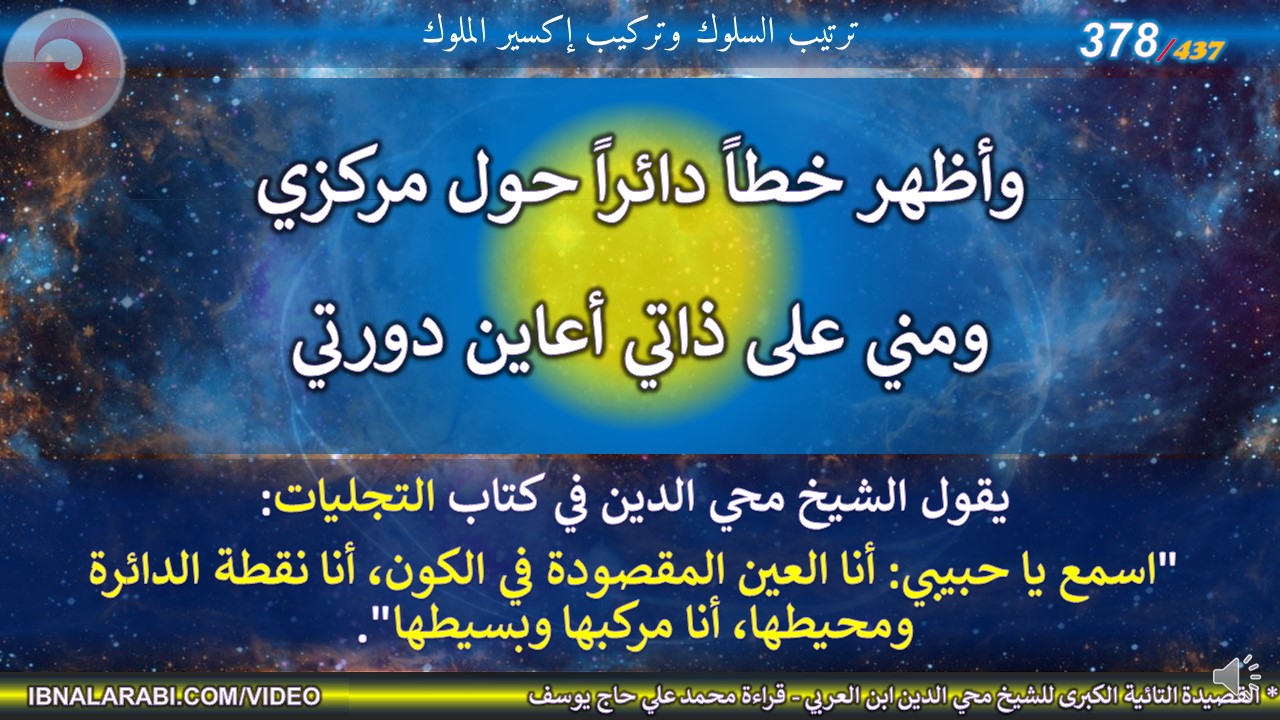 يقول الشيخ محي الدين في كتاب التجليات: "اسمع يا حبيبي: أنا العين المقصودة في الكون، أنا نقطة الدائرة ومحيطها، أنا مركبها وبسيطها".