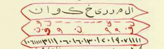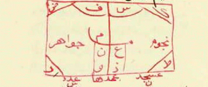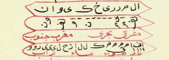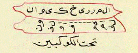 دائرة كرة مصر مقدار أفقها لا تزال بادعة ومع حكامها مخادعة ولأثقال الأمور موادعة حتى يقابل المريخ كيوان في آخر درجة من الميزان تخرج من يد آل عثمان ، واعلم أن السر المكتوم المكنون في هذه الأحرف من الدال إلى النون ، فطريقة استخراج ما فيها من الأسرار الخفية أن تؤخذ أعداد الأحرف كلها جريدة واحدة بالجمل الكبير وتعقد جملة واحدة ويزاد عليها قدرها مرة واحدة ويعمر بها وفق الكاف بشروطه ويلقط 12 12 أدوار حتى يتم لقطة ينظر في الأحرف الملقوطة فتعزل كل طليعة وحدها .